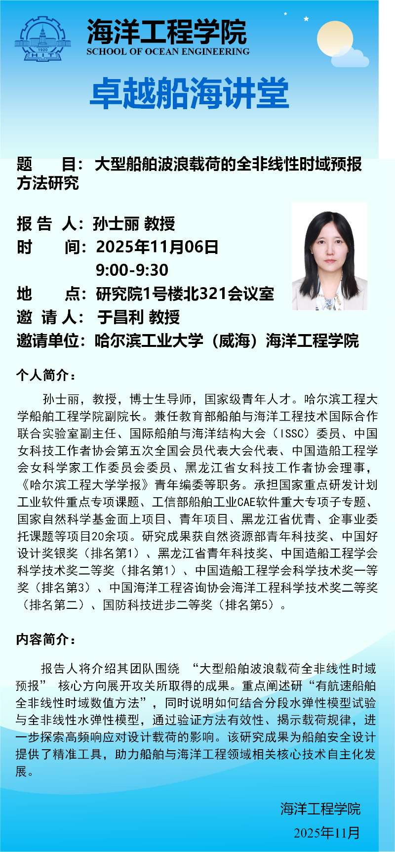 孙士丽,教授,博士生导师,国家级青年人才。哈尔滨工程大学船舶工程学院副院长。兼任教育部船舶与海洋工程技术国际合作联合实验室副主任、国际船舶与海洋结构大会(ISSC)委员、中国女科技工作者协会第五次全国会员代表大会代表、中国造船工程学会女科学家工作委员会委员、黑龙江省女科技工作者协会理事,《哈尔滨工程大学学报》青年编委等职务。承担国家重点研发计划工业软件重点专项课题、工信部船舶工业CAE软件重大专项子专题、国家自然科学基金面上项目、青年项目、黑龙江省优青、企事业委托课题等项目20余项。研究成果获自然资源部青年科技奖、中国好设计奖银奖(排名第1)、黑龙江省青年科技奖、中国造船工程学会科学技术奖二等奖(排名第1)、中国造船工程学会科学技术奖一等奖(排名第3)、中国海洋工程咨询协会海洋工程科学技术奖二等奖(排名第二)、国防科技进步二等奖(排名第5)。