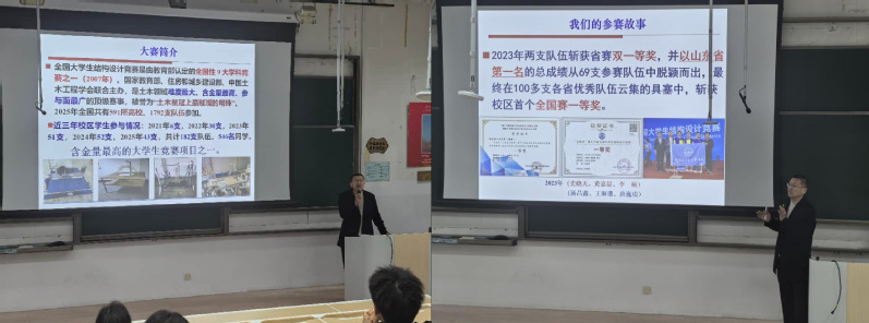 2026年3月16日晚,第十九届全国大学生结构设计大赛宣讲会在功学楼101召开,土木工程系王化杰老师作为主讲人。